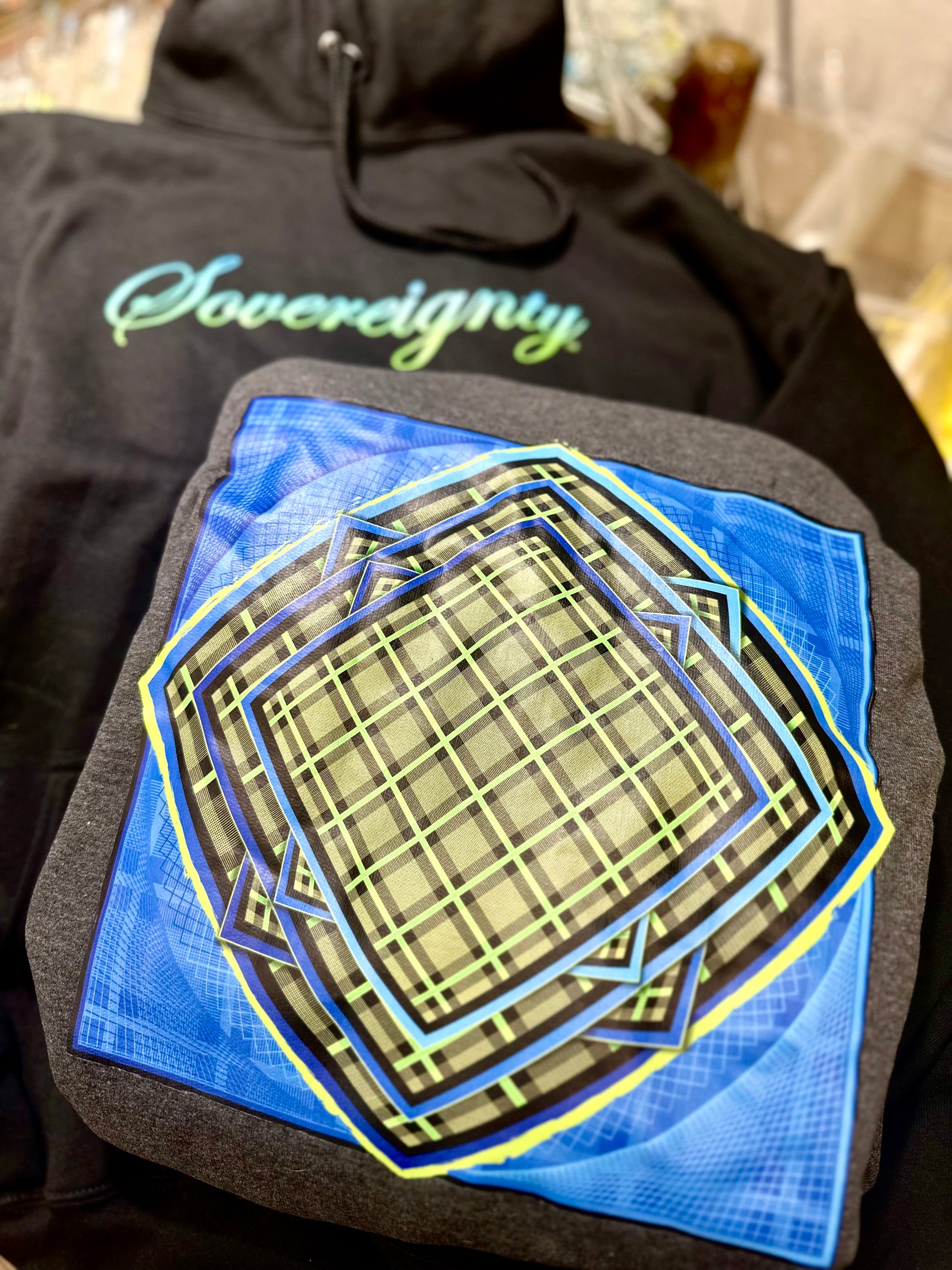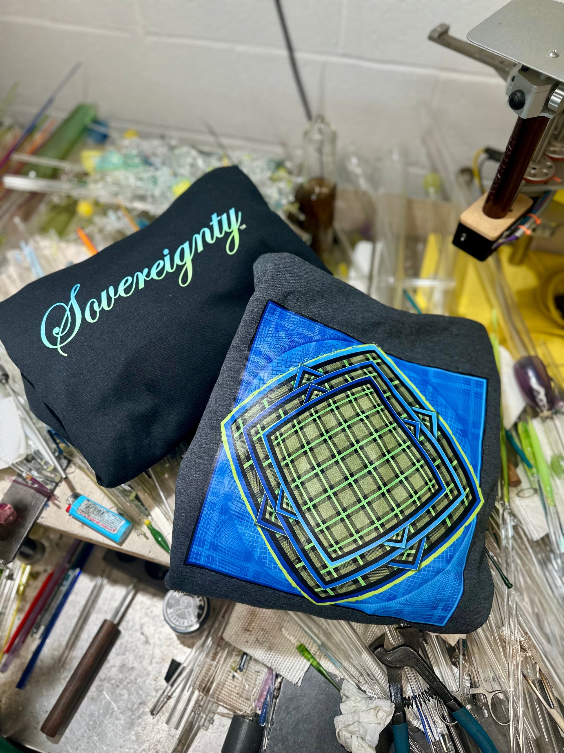 2025 Sovereignty Glass pullover hoodies with artwork on backside and classic Sovereignty logo across the front. Port & Company core fleece 50/50 blend with pouch pocket. Comes in charcoal gray or black - images are the same for both.